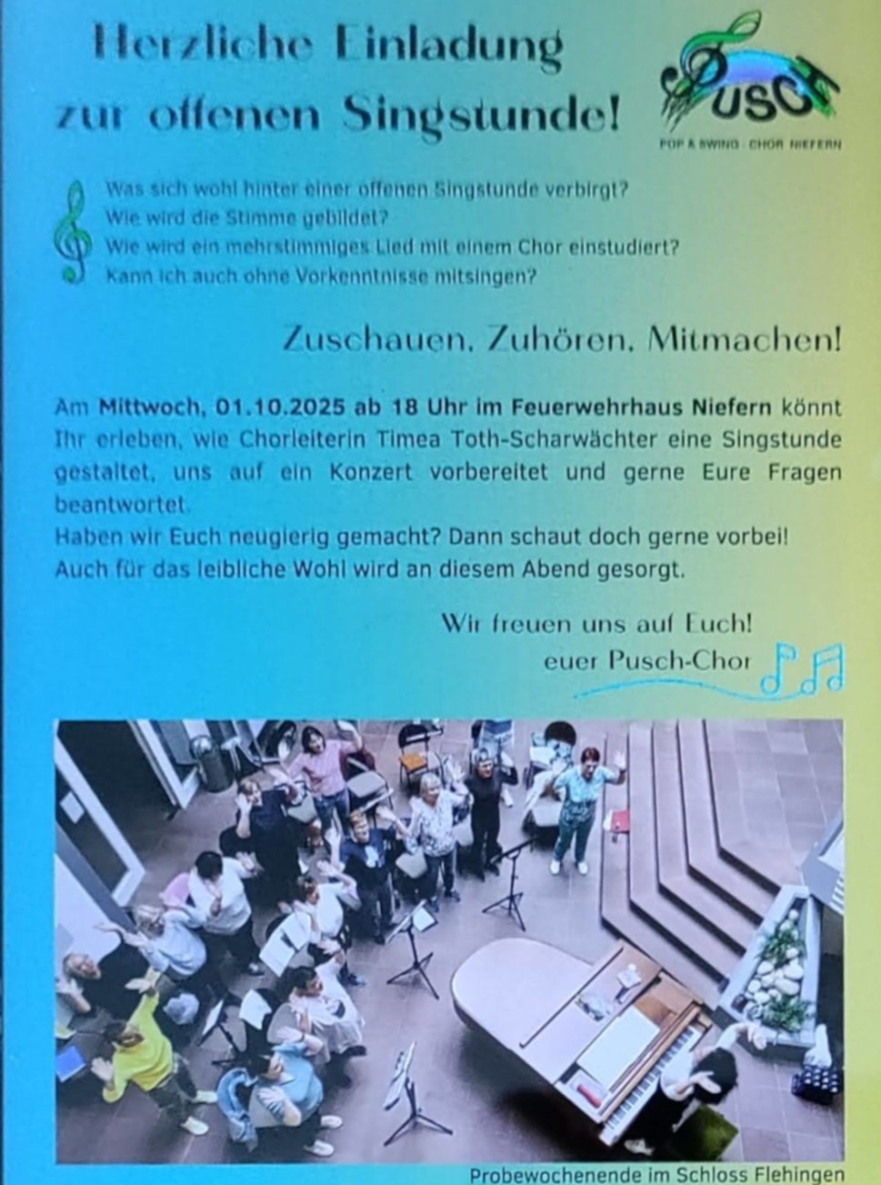 Am Mittwoch, 01.10.2025 ab 18.00 Uhr im Feuerwehrhaus Niefern könnt Ihr erleben wie Chorleiterin Timea Toth-Scharwächter eine Singstunde gestaltet, uns auf ein Konzert vorbereitet und gerne Eure Fragen beantwortet.